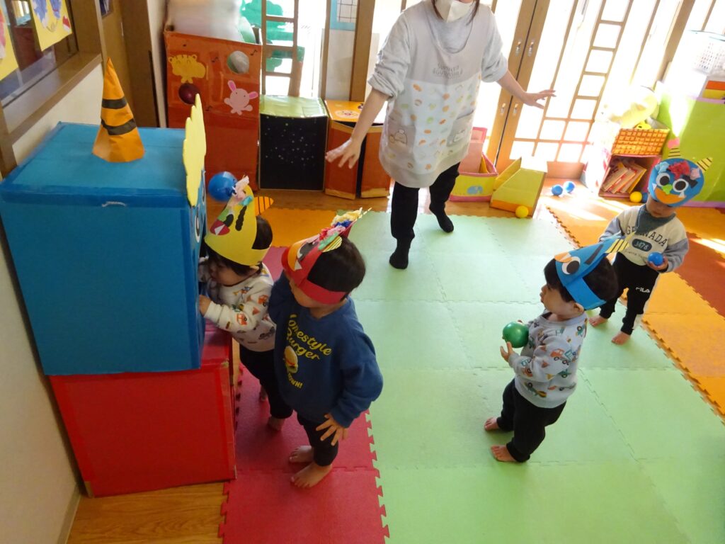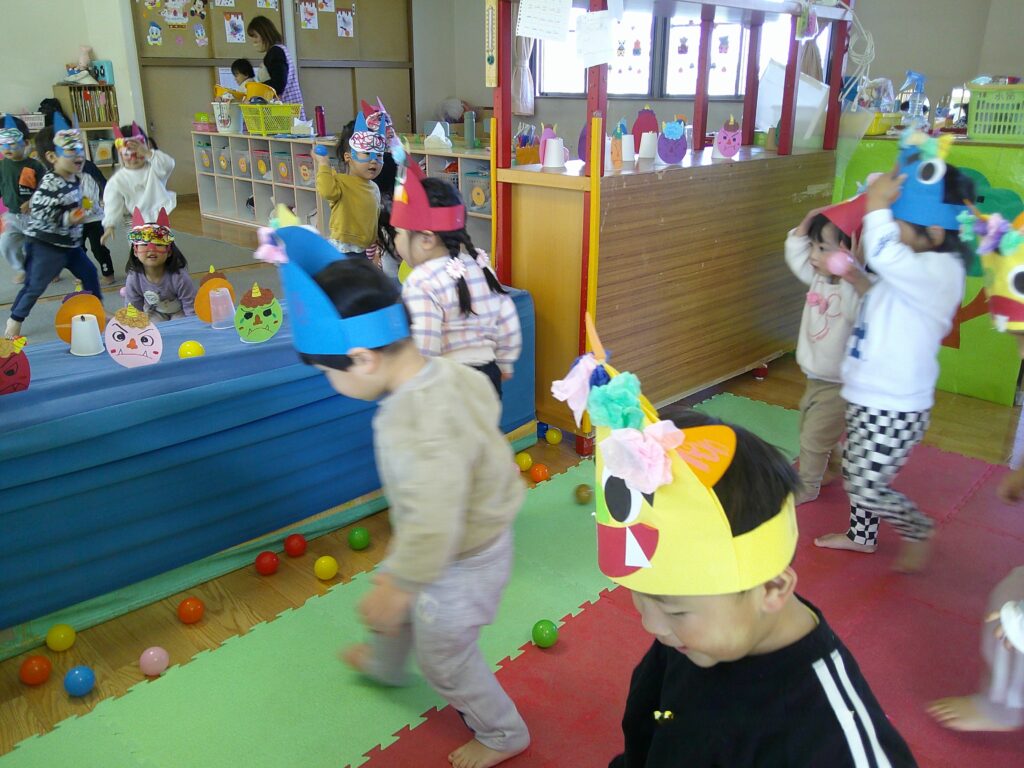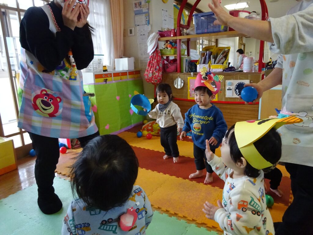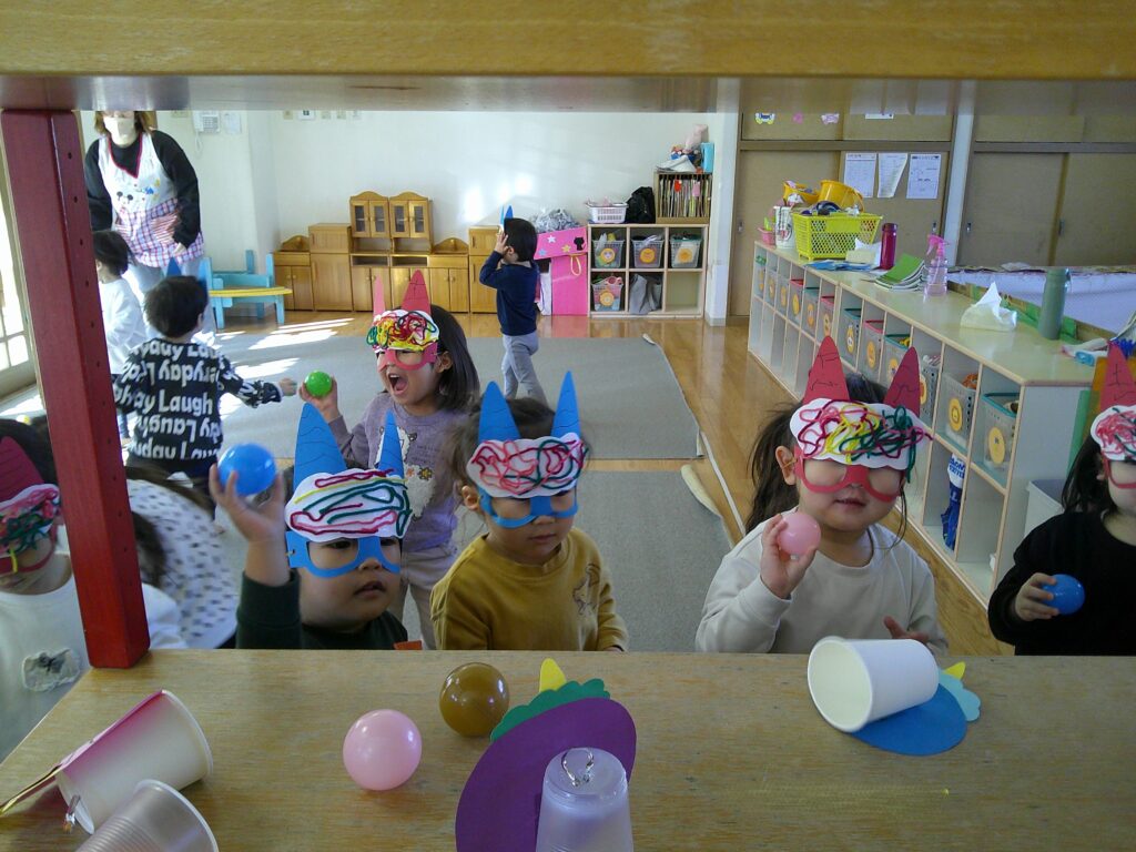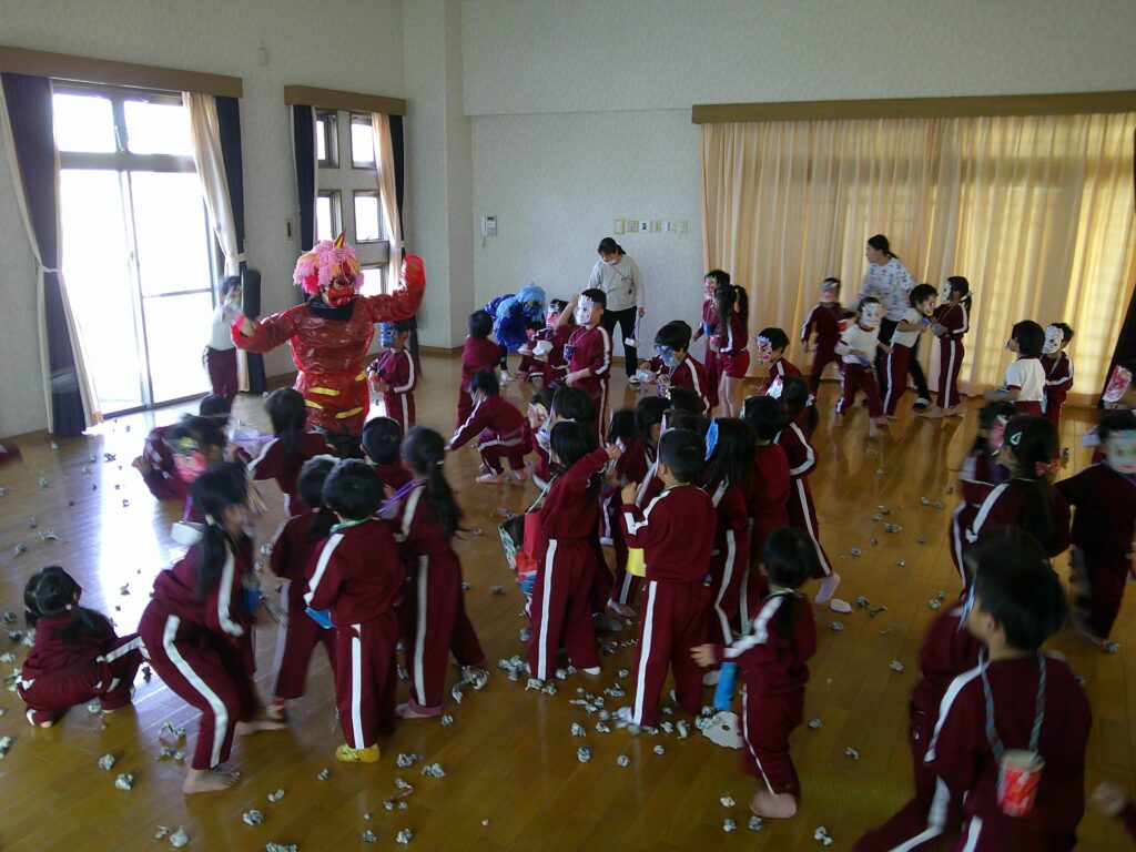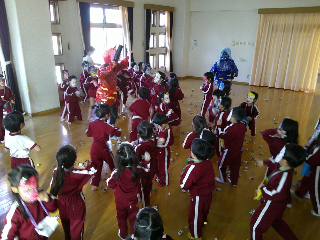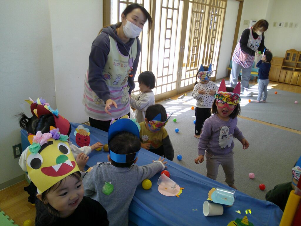 こども達が思い思いに作り上げたお面をつけて節分の行事を楽しみました。